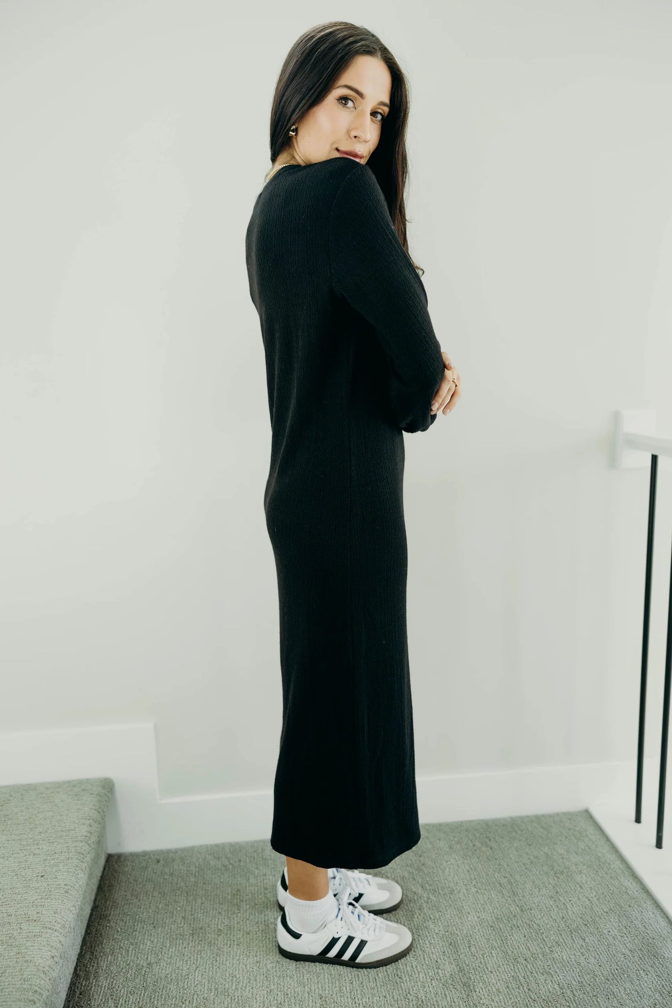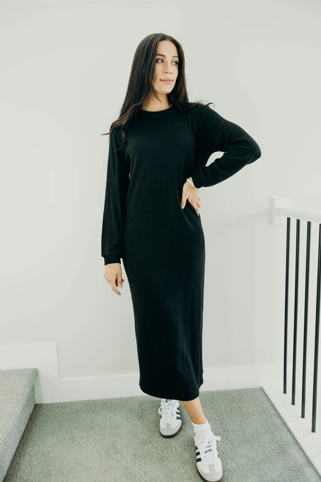 Textured sweater dress with high neckline, long sleeves and a slit.