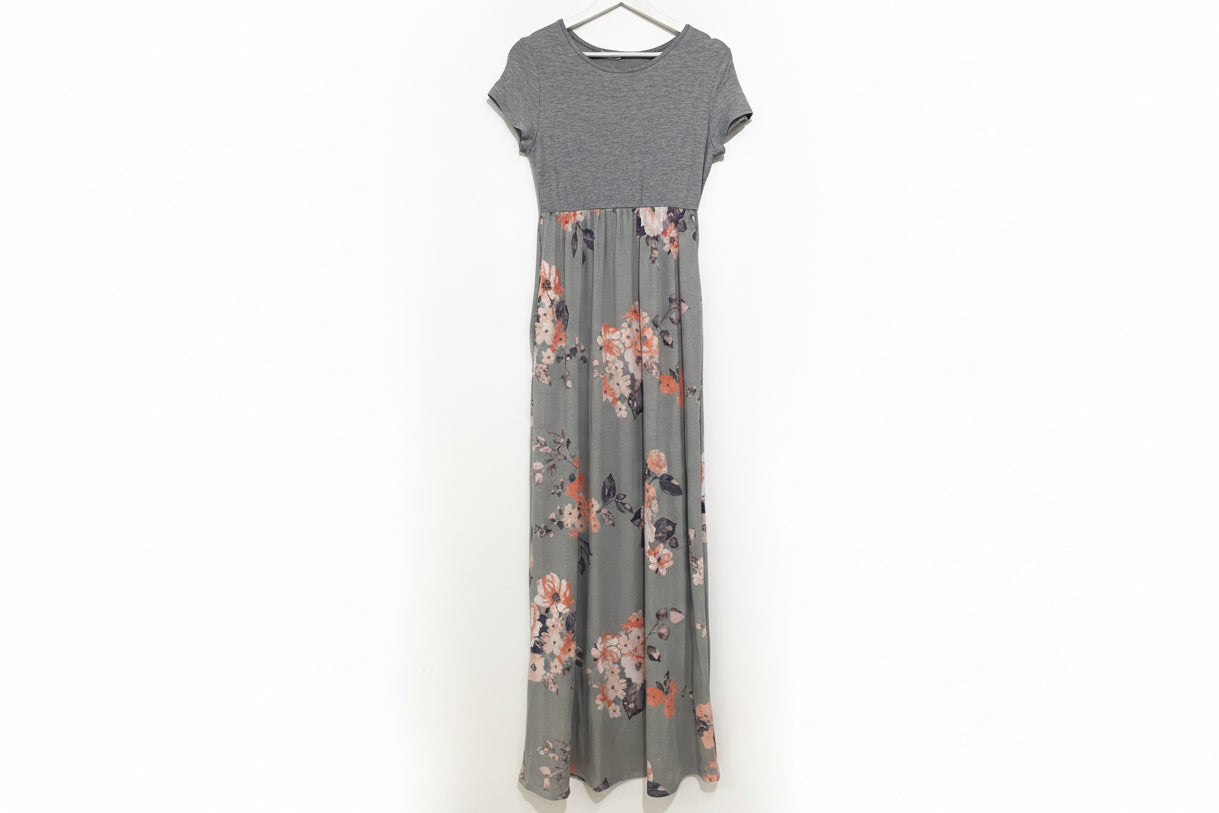 Short sleeved, floral maxi dress, with round neckline. Light and flowy, perfect for summer!