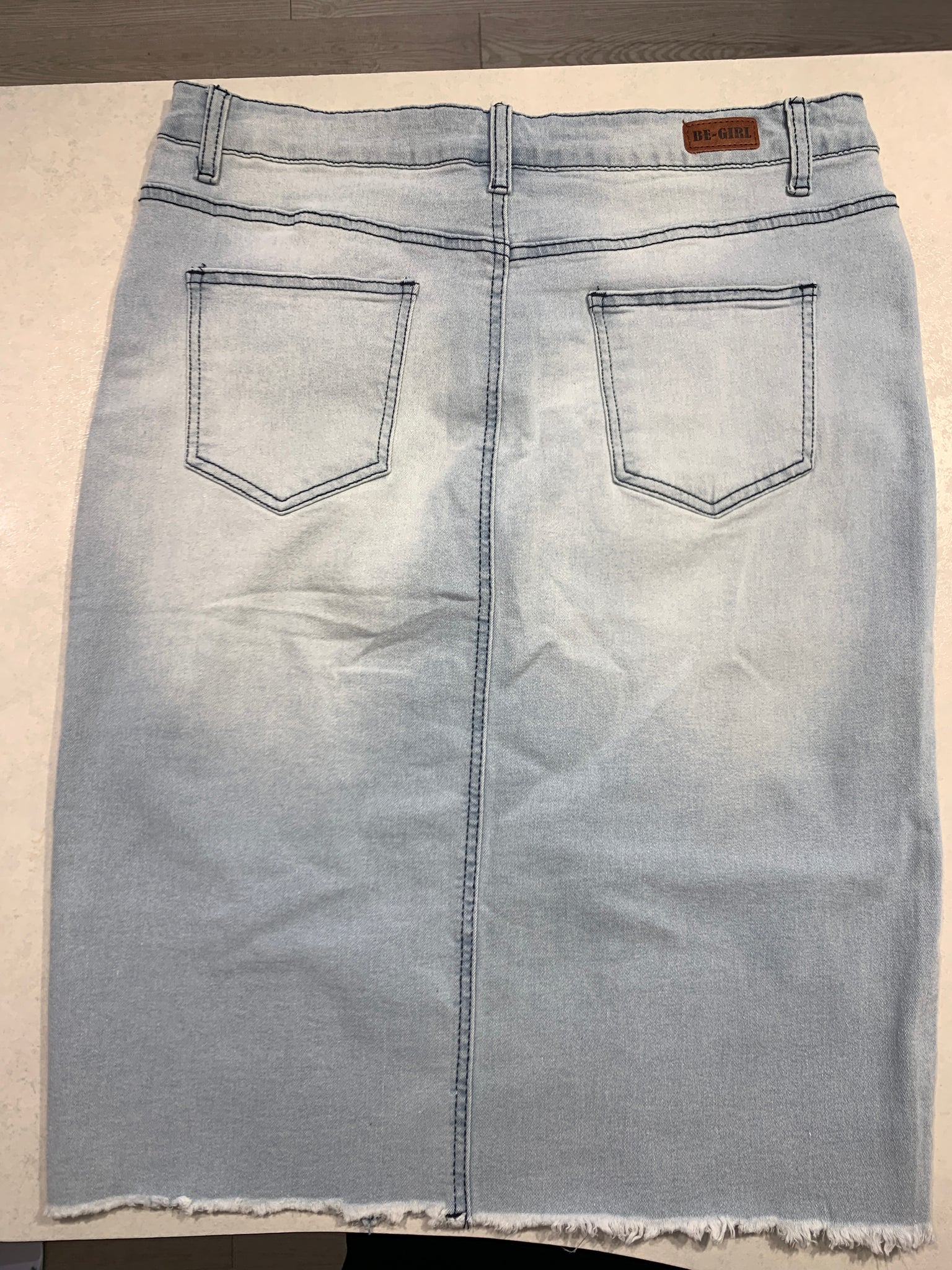 Stretch denim pencil skirt with frayed hem effect and frayed patches on front. Side pockets and back pockets. Zipper and button for closure. No slit. Length: 24"