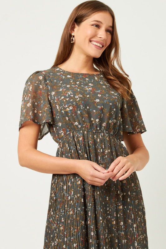 Beautiful black floral dress with butterfly sleeves and accordion skirt! Pair it with a perfect pair of heels and you'll steal the show!!