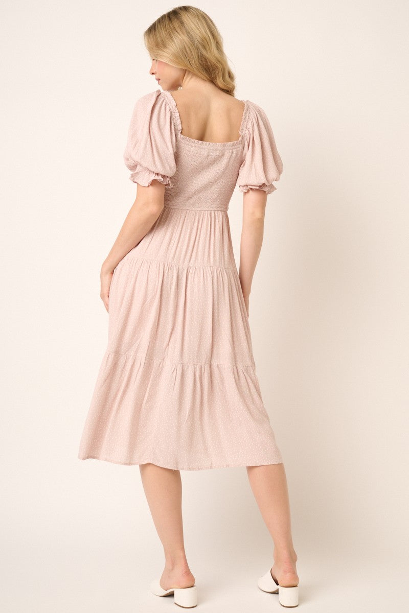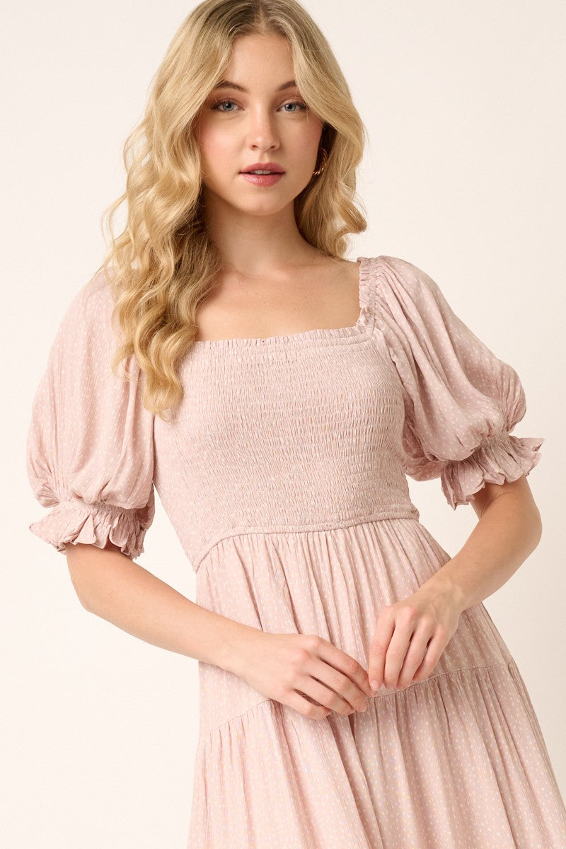 Adorable Mini Dot Print Midi dress with a smocked bodice, square neckline, and balloon sleeve with ruffle detail. Ruffle detail on the skirt makes it flowingly elegant.