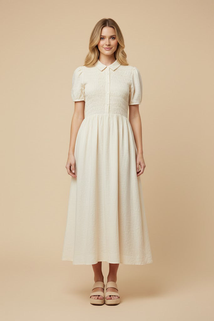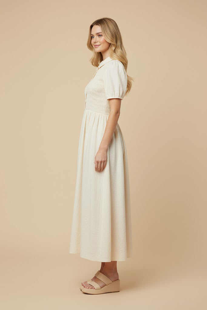 Smocked Bodice Button Up Collar Dress 0404 in Ivory