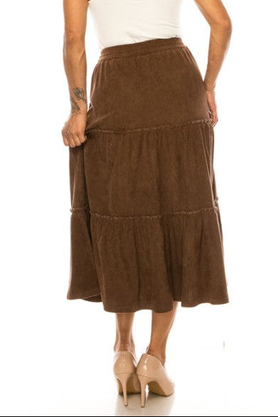 A-line corduroy skirt with three tiered layers and elastic waistband.