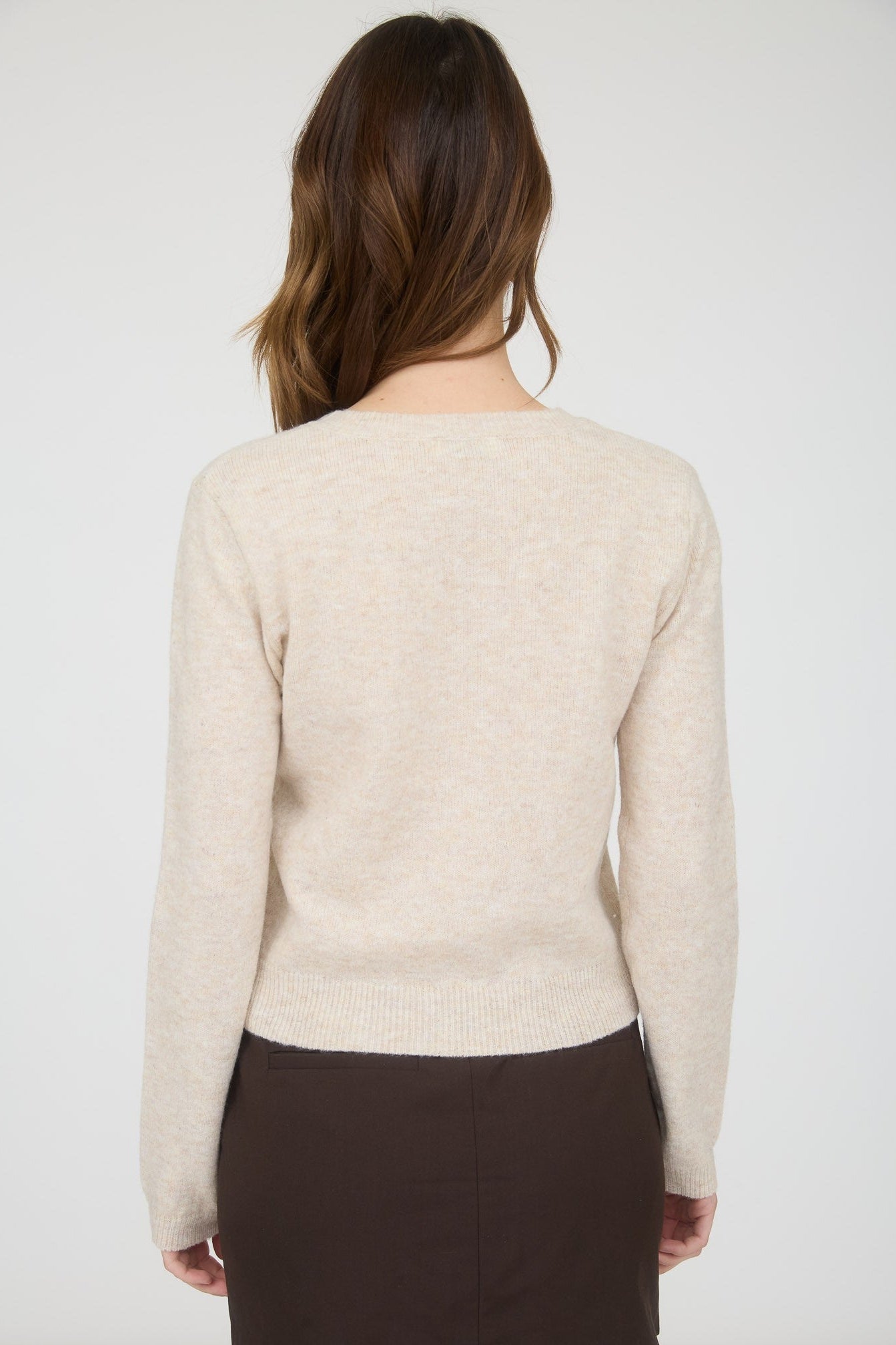 Soft knitted long sleeve button down cardigan with a round high neckline.